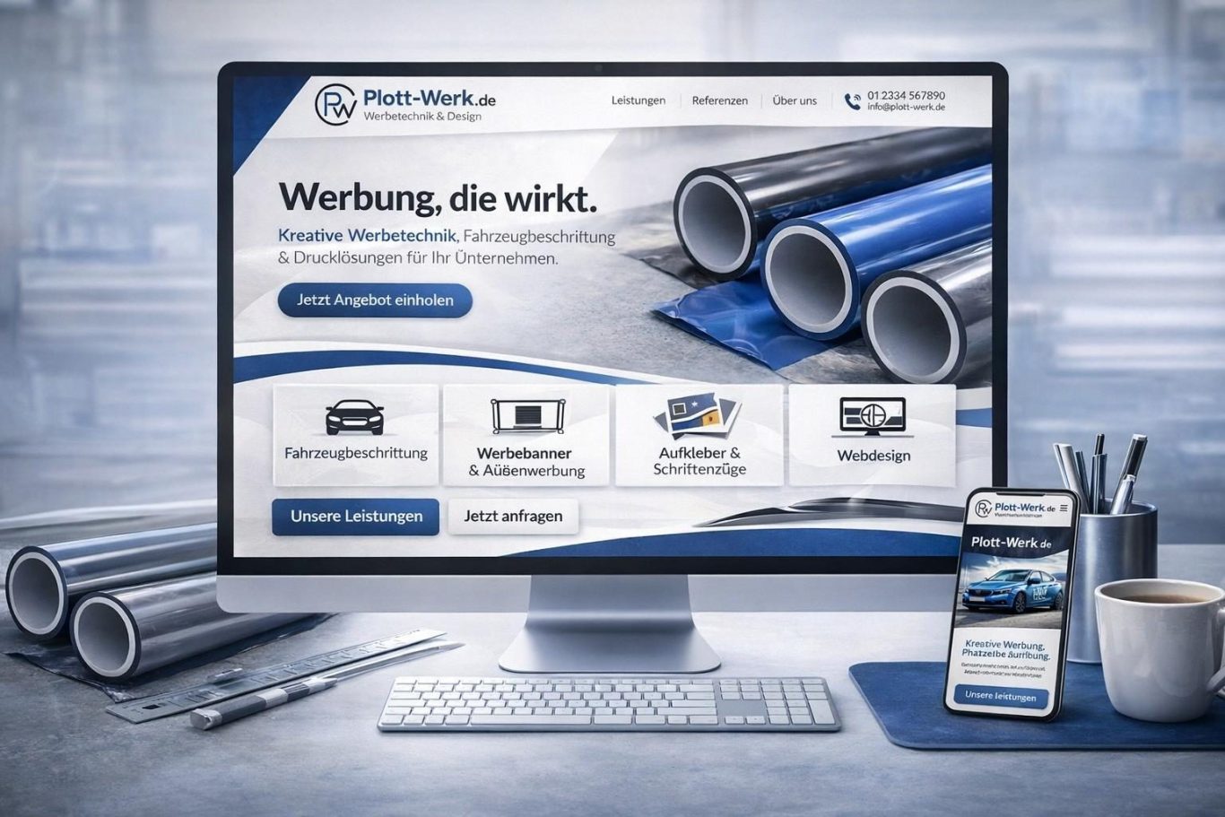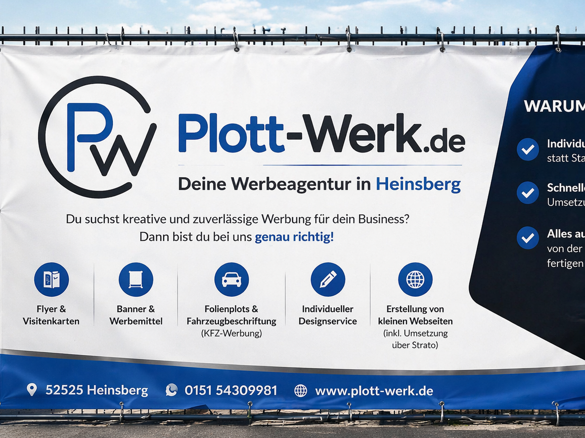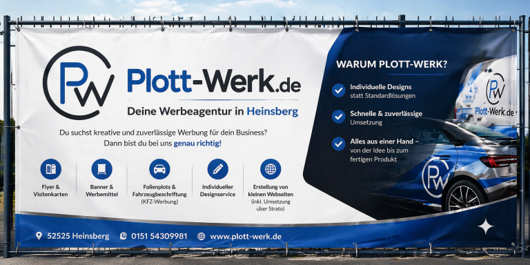 Plott-Werk.de ist Ihr professioneller Anbieter für moderne Werbetechnik, Fahrzeugbeschriftung und individuelle Werbemittel. Wir gestalten und produzieren hochwertige Autowerbung, Schaufensterbeschriftungen, Schriftenzüge, Aufkleber, Banner und Flyer für Unternehmen, Selbstständige und Privatkunden.