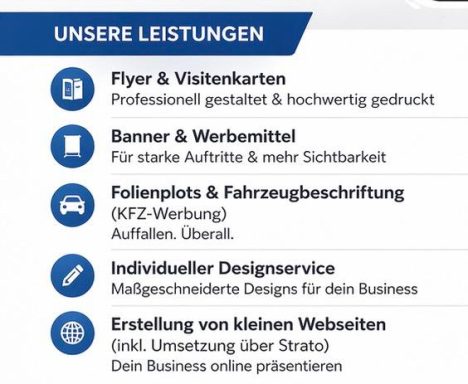 Wir gestalten Ihr Logo und entwickeln individuelle Designs für Ihr Fahrzeug sowie Ihre gesamte Werbepalette. Unser Ziel ist es, Ihre Marke erfolgreich in Szene zu setzen und unverwechselbare Werbemittel zu kreieren, die Ihre Zielgruppe ansprechen. Vertrauen Sie auf unsere Kreativität und Fachkompetenz im Werbemittel Design, um Ihre Unternehmensidentität optimal zu kommunizieren und sich von der Konkurrenz abzuheben.